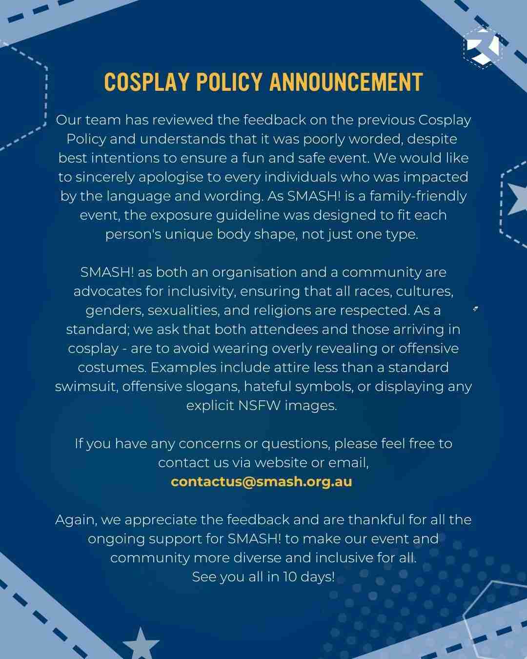 Our team has reviewed the feedback on the previous Cosplay Policy and understand that it was poorly worded, despite best intentions to ensure a fun, and safe event. We would like to sincerely apologise to every individuals who was impacted by the language and wording. As SMASH! is a family-friendly event, the exposure guideline was designed to fit each person's unique body shape, not just one type.